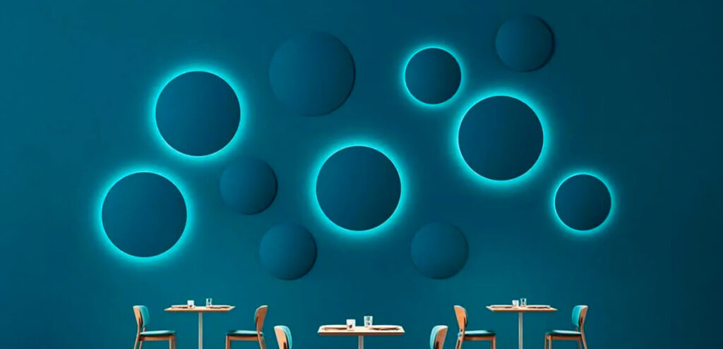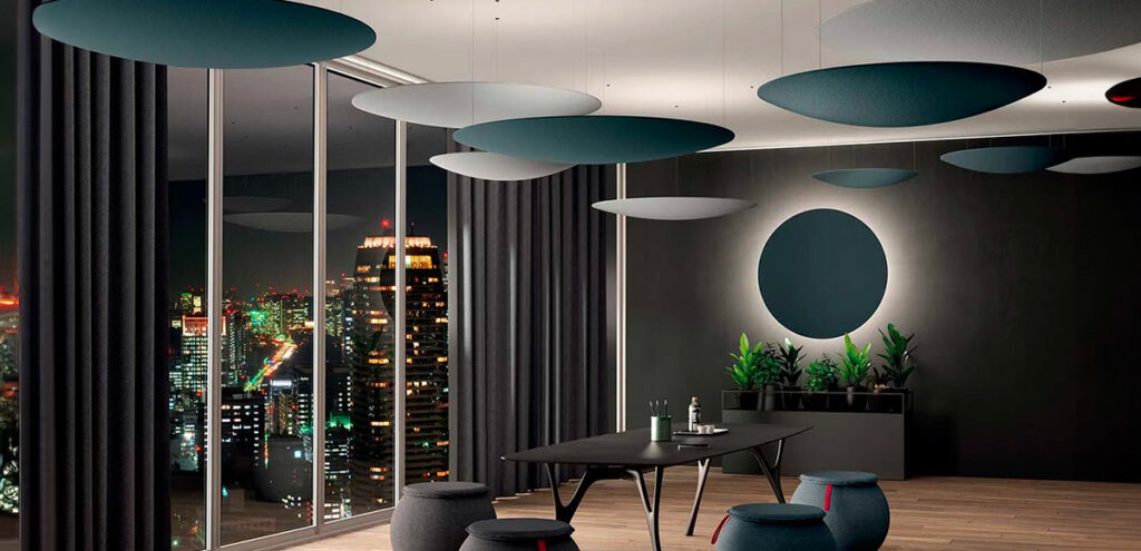 איי תקרה ובאפלים, פאנלים לקיר, וילונות אקוסטיים, אלמנטים מרופדים וגופי תאורה אקוסטיים – לעיתים רכיב אחד מספק אקוסטיקה + תאורה + חלוקת אזורים. - תיאום עם תאורה וזרימות תנועה